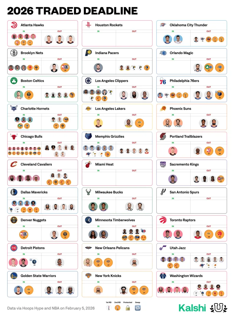 虎扑02月06日讯 美媒Basketball University分享联盟各队交易截止日变化。